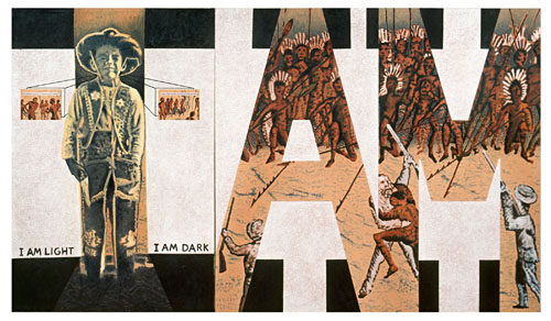 Gordon Bennett (b. 1955), “Self portrait (But I always wanted to be one of the good guys)” (1990), held in a Private collection, Brisbane; Photo by Phillip Andrews; from ABC Radio National