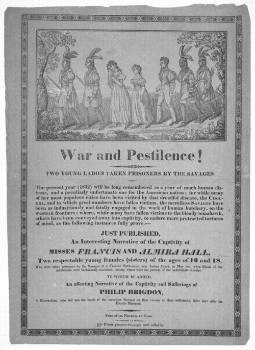 War and pestilence! Two young ladies taken prisoners by the savages, 1833 woodcut, Library of Congress Rare Book and Special Collections Division Washington, D.C.