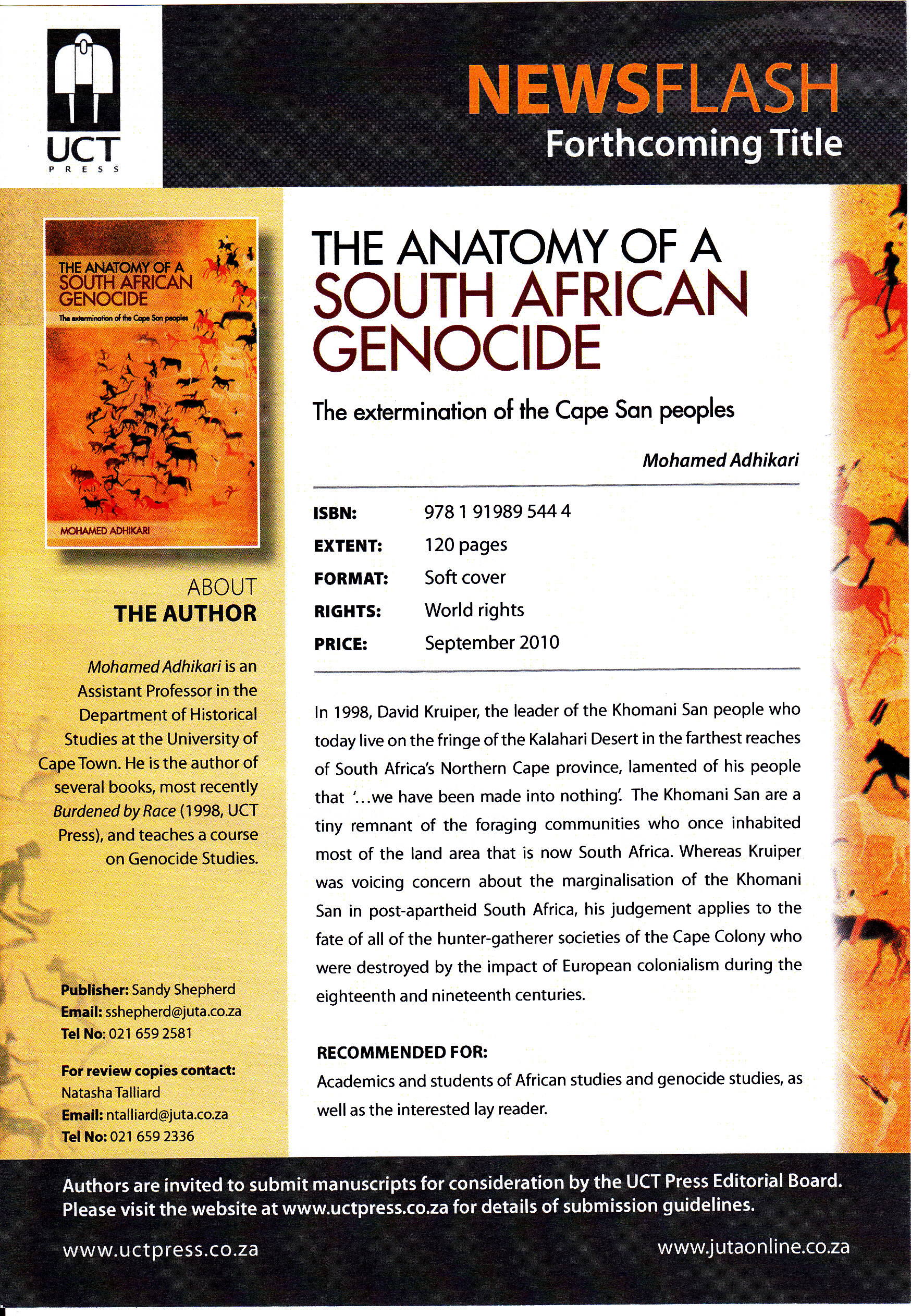 News from UCT press about a forthcoming book by Mohamed Adhikari, on San-trekboer relationships along the Cape frontier.